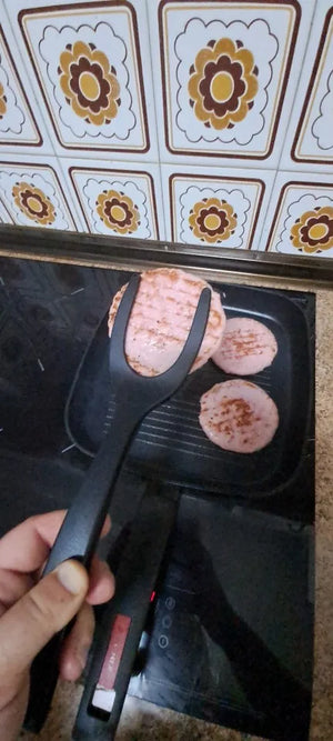 Simplifica tu cocina con una herramienta todo en uno que hace que voltear y agarrar alimentos sea fácil y eficiente.
